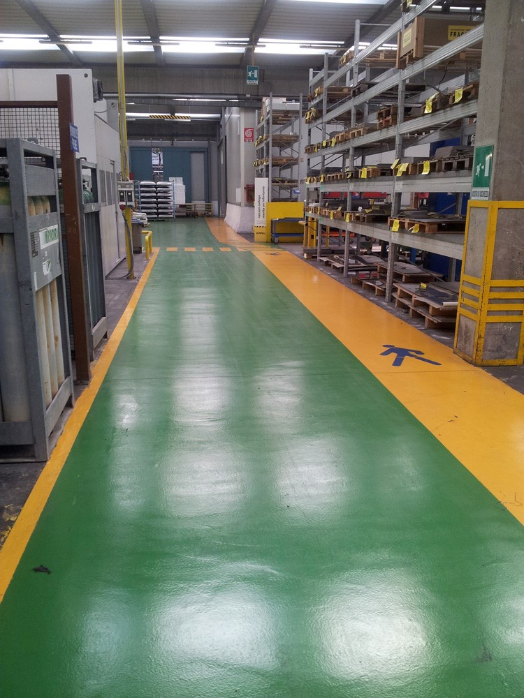 Pavimento in resina epossidica o poliuretanica applicato a spatola con vari sistemi di stratificazione di resina ed inerti minerale che conferiscono al pavimento ottime caratteristiche di resistenza al graffio, all'usura, alla compressione e a vari agenti chimici, realizzabile in tinte ral, ideale per pavimenti industriali, settore farmaceutico, alimentare e per parcheggi con finiture antisdruciolo. Dal traffico medio-pesante, possibilità di finiture lucide, opache o satinate.